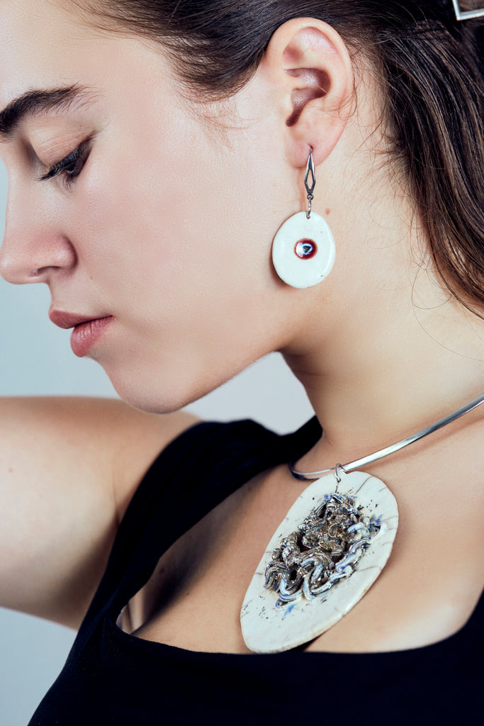 Orecchini in ceramica Raku con pendente bianco ovale in cui è incastonata una piccola murrina blu e rossa